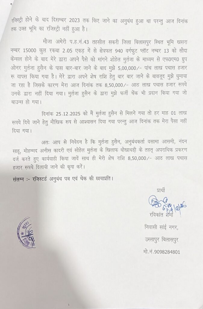 The complainant, Ravikant Sharma, a clerk posted at the Bilaspur Collectorate and a resident of Sai Nagar in Uslapur, has lodged a complaint at Sakri police station. According to Sharma, he entered into an agreement with Shohel Murtaza, director of FM Group, to purchase a 940-square-foot plot located in the Sakri area under Ameri Patwari Circle.