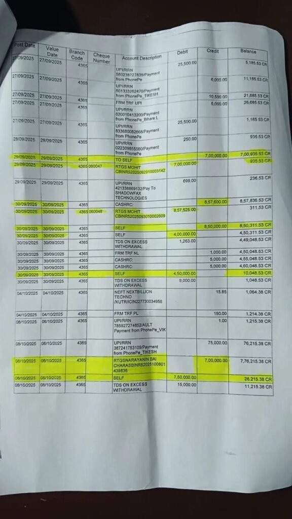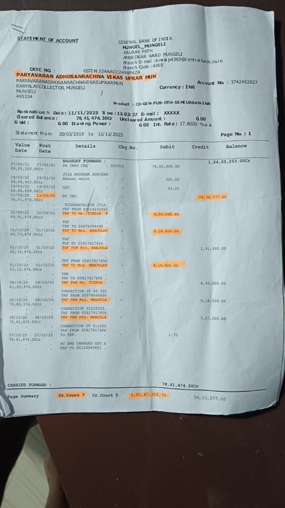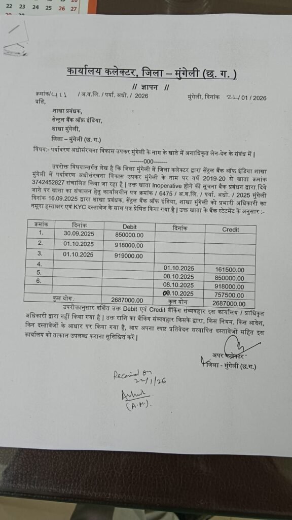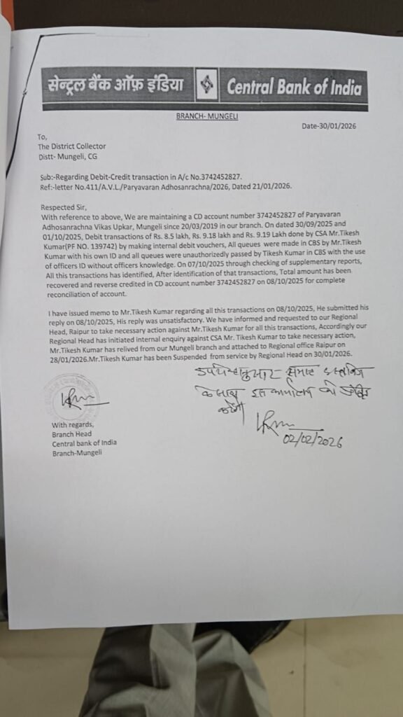 Mungeli, India — Serious concerns have been raised over the security of government funds following the exposure of a major financial irregularity at the Central Bank of India’s Mungeli branch. An amount of ₹2.687 million (approximately USD 32,000) from a government infrastructure account maintained by the Mungeli Collectorate was allegedly transferred without authorization, triggering administrative and public outrage.