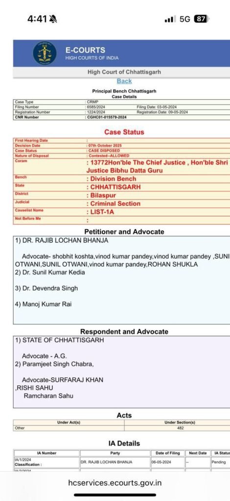 Bilaspur In a landmark judgment, the Chhattisgarh High Court has given a major reprieve to four doctors from Apollo Hospital, Bilaspur, by quashing the FIR and chargesheet filed against them in a seven-year-old case. The Division Bench comprising Chief Justice Ramesh Sinha and Justice B.D. Guru allowed the petition, ruling that the criminal case was not justified.