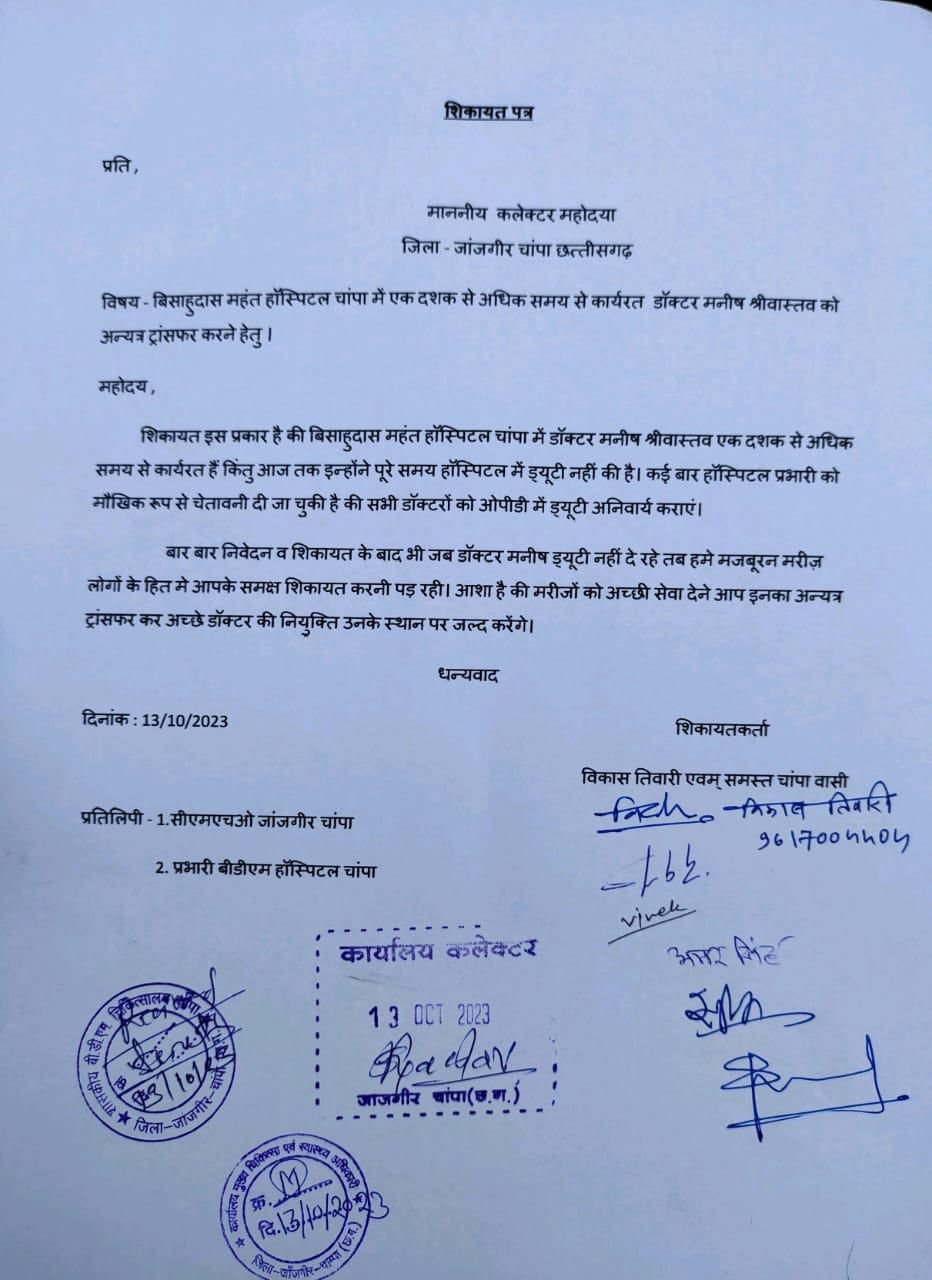 Dr. Manish Shrivastava was previously posted at BDM Hospital, Champa, where local citizens had reportedly submitted written complaints to the District Collector. The complaints alleged that he was frequently absent from the Outpatient Department (OPD), causing long waiting times for patients and disruptions in treatment.